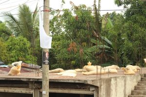 We walked up the rough concrete stairs on the side of the building – ducking under bare electrical wires strung between the house and the garage – to see where Gambo’s workers dry the cacao beans on the concrete roof on warm, sunny days. It takes three days to dry the beans, he said, and the workers turn them several times with rakes to hasten the process.